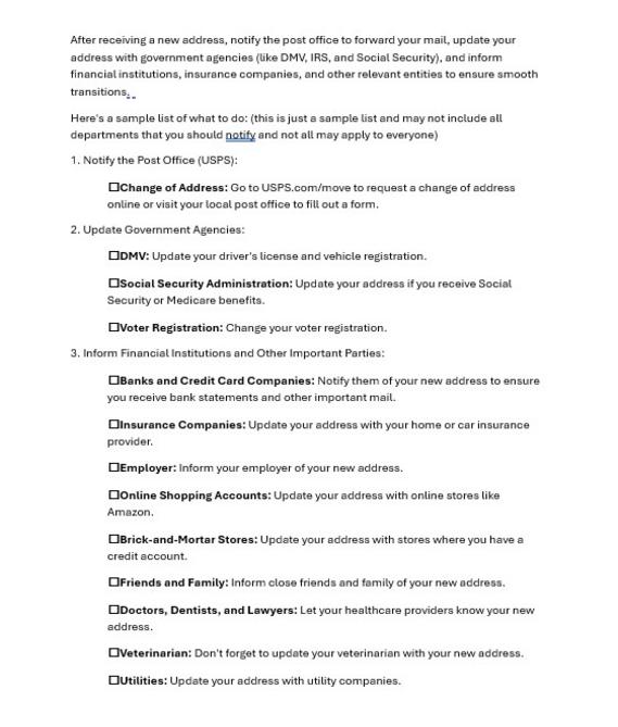 After receiving a new address, notify the post office to forward your mail, update your address with government agencies (like DMV, IRS, and Social Security), and inform financial institutions, insurance companies, and other relevant entities to ensure smooth transitions. It is the responsibility of the resident to notify all departments / companies.