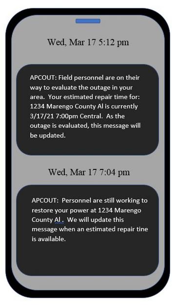 The is an example of a text from Alabama Power that you can receive if you sign up for text messages.